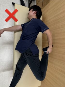 *腰を反ってしまうと前ももが上手く伸びません。腰が反らないよう体は少し前傾させ、手で引っ張るようにしましょう。慣れてきたら立ってやってもらっても構いません。