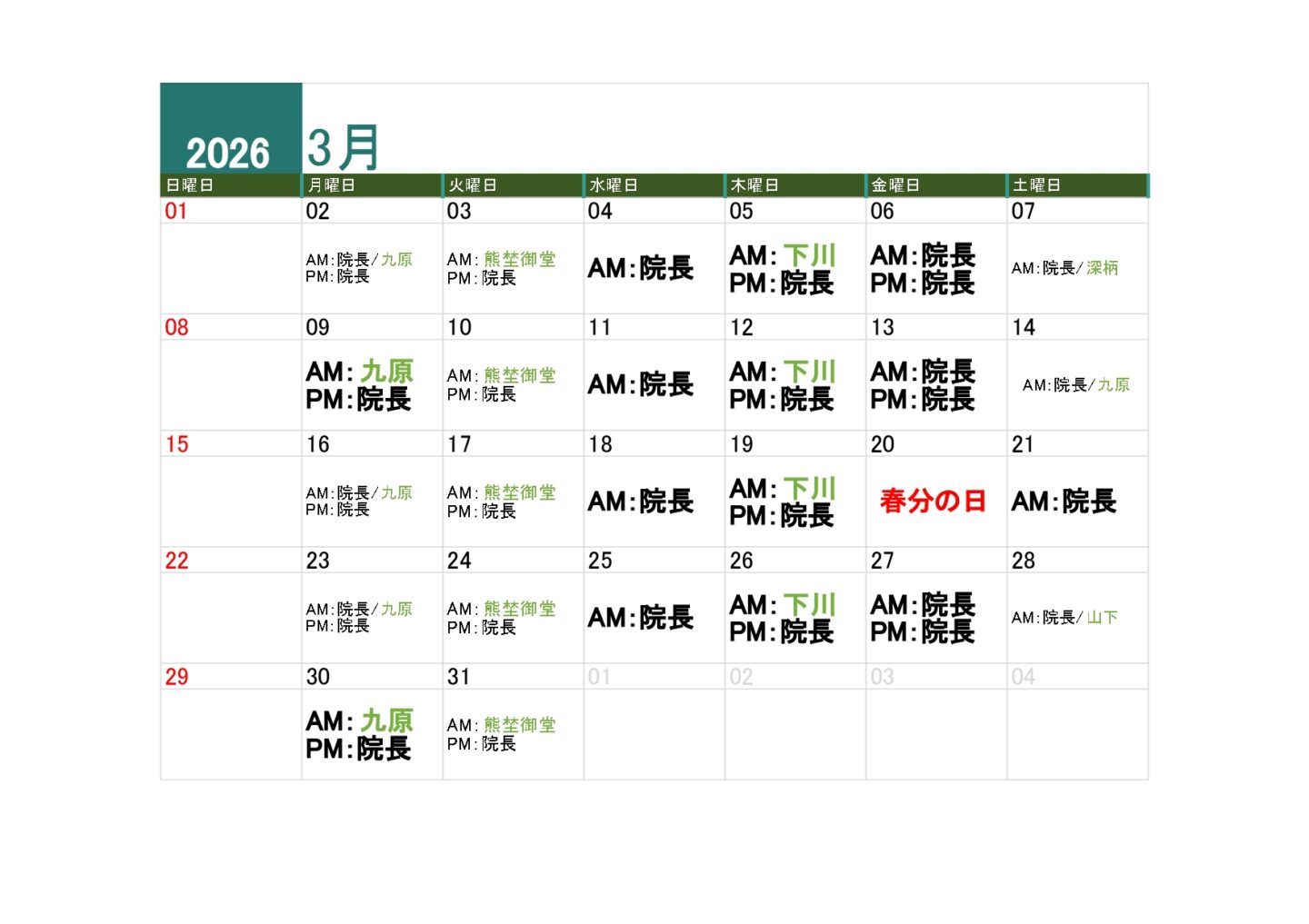 担当医表は以下の通りとなります。ご確認のうえご予約をおとりください。