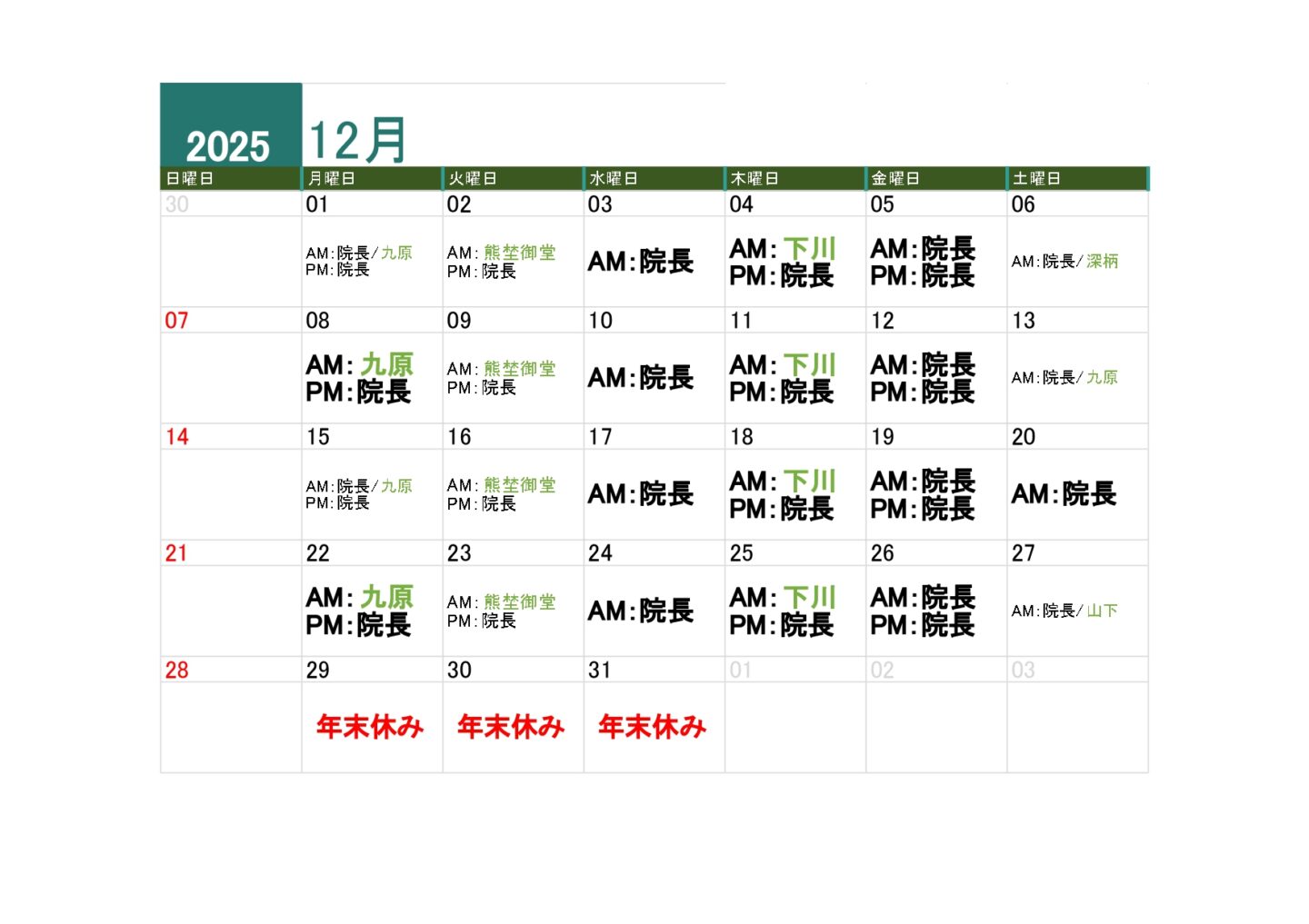 担当医表は以下の通りとなります。何かございましたら,ご確認のうえご予約をおとりください。
